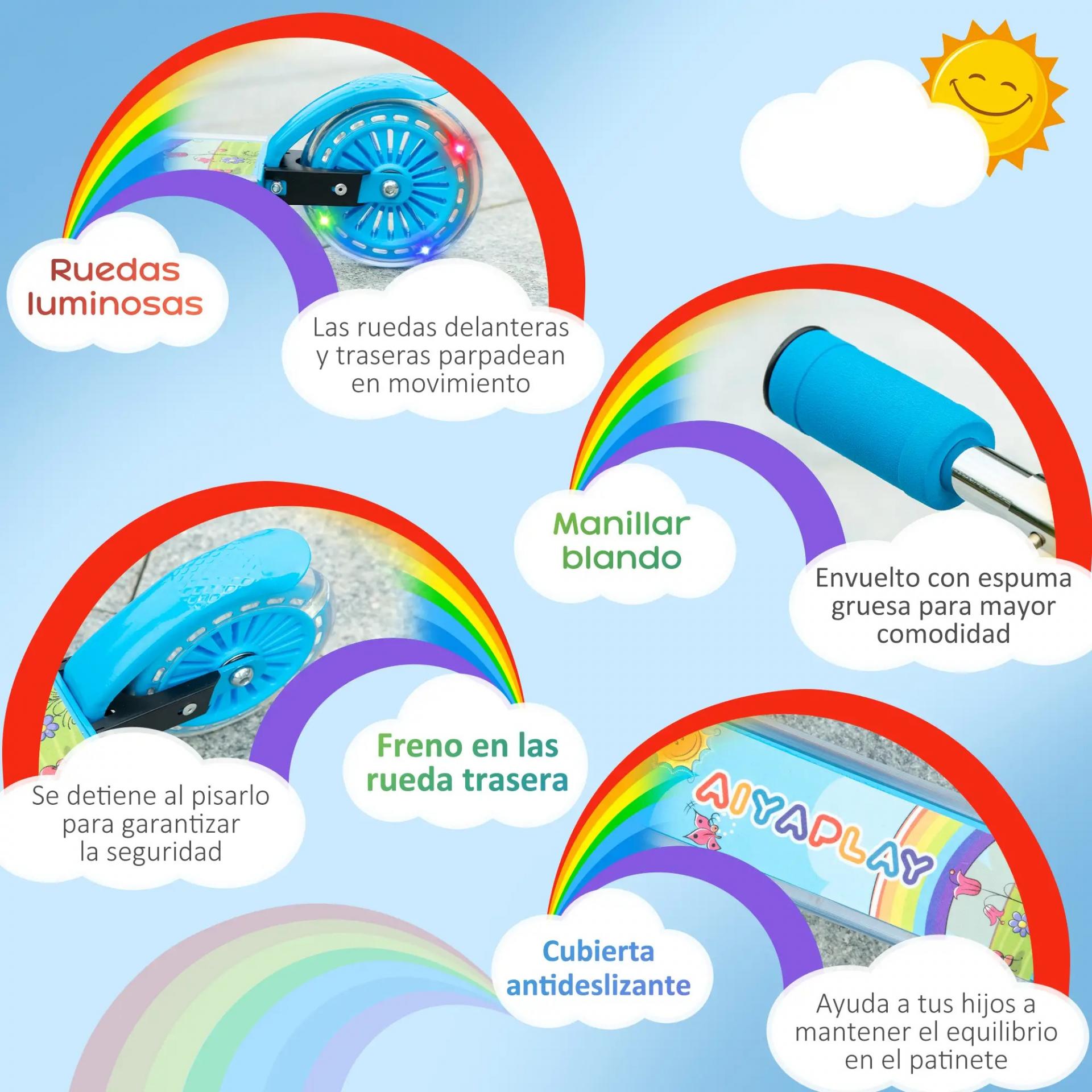 - - ESTRUCTURA RESISTENTE: Este patinete para niños está fabricado con estructura metálica y ruedas de plástico para un uso estable y seguro. El freno posterior se acciona fácilmente con el pie y los puños del manillar ofrecen un agarre cómodo