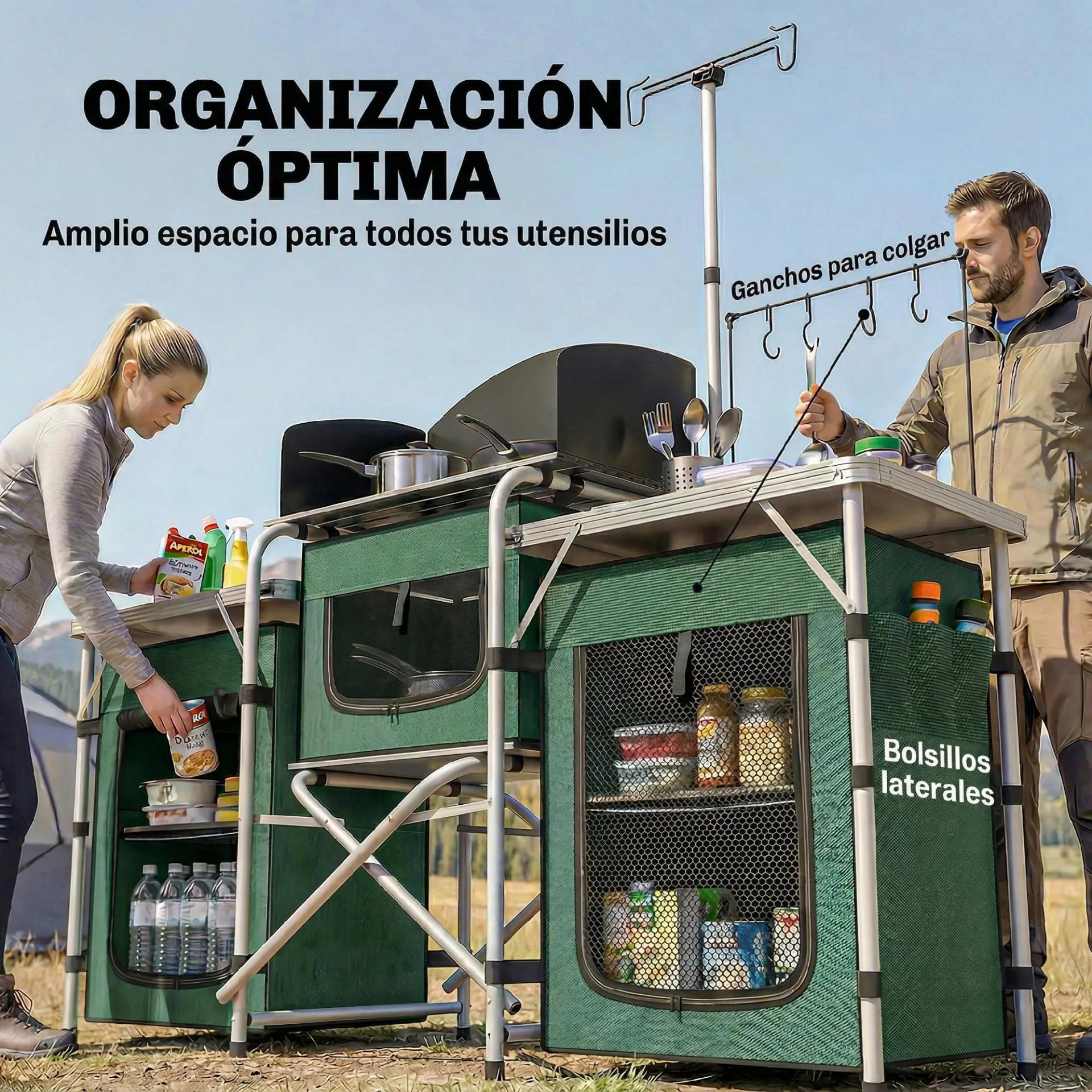 - ORGANIZACIÓN EFICIENTE: Mesa de aluminio con 2 laterales, 4 estantes, 4 ganchos y un armario inferior para guardar utensilios. Tres armarios con puerta de malla enrollable protegen la comida. Incluye lámpara ajustable para cenas al aire libre