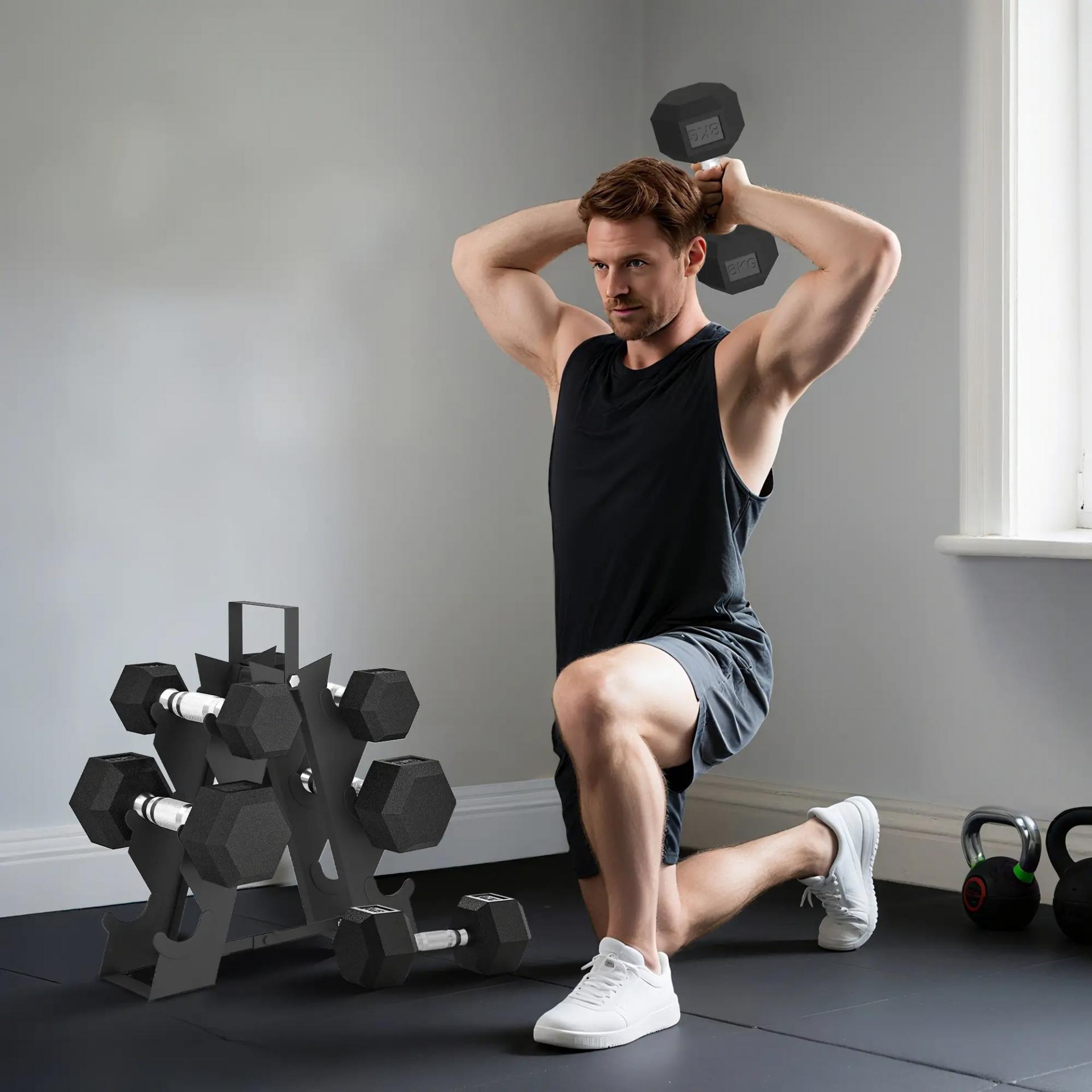 - - ORDEN Y AHORRO DE ESPACIO: Incluye un soporte vertical compacto que mantiene el kit de mancuernas organizado y fuera del suelo. Ideal para mantener tu zona de entrenamiento limpia y accesible