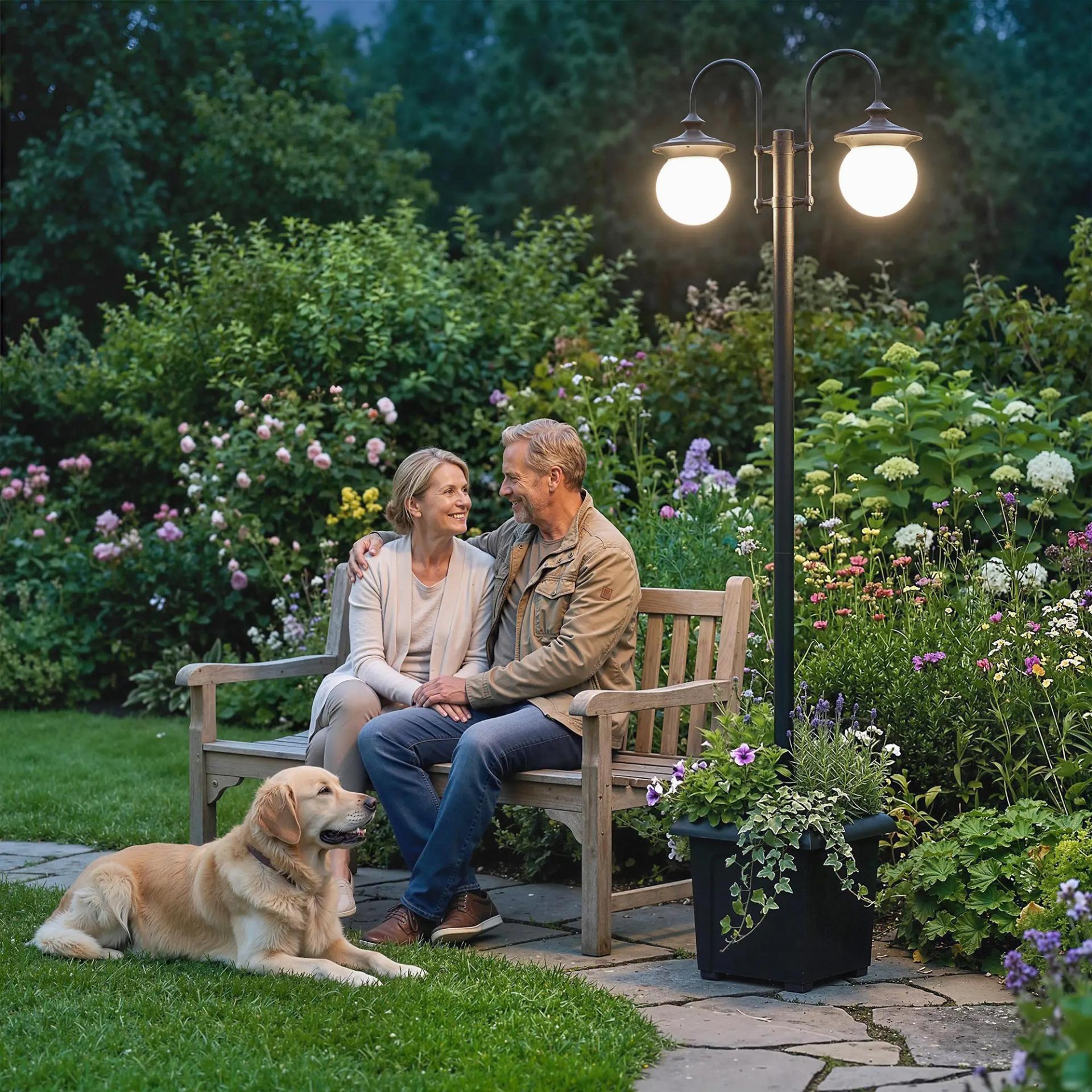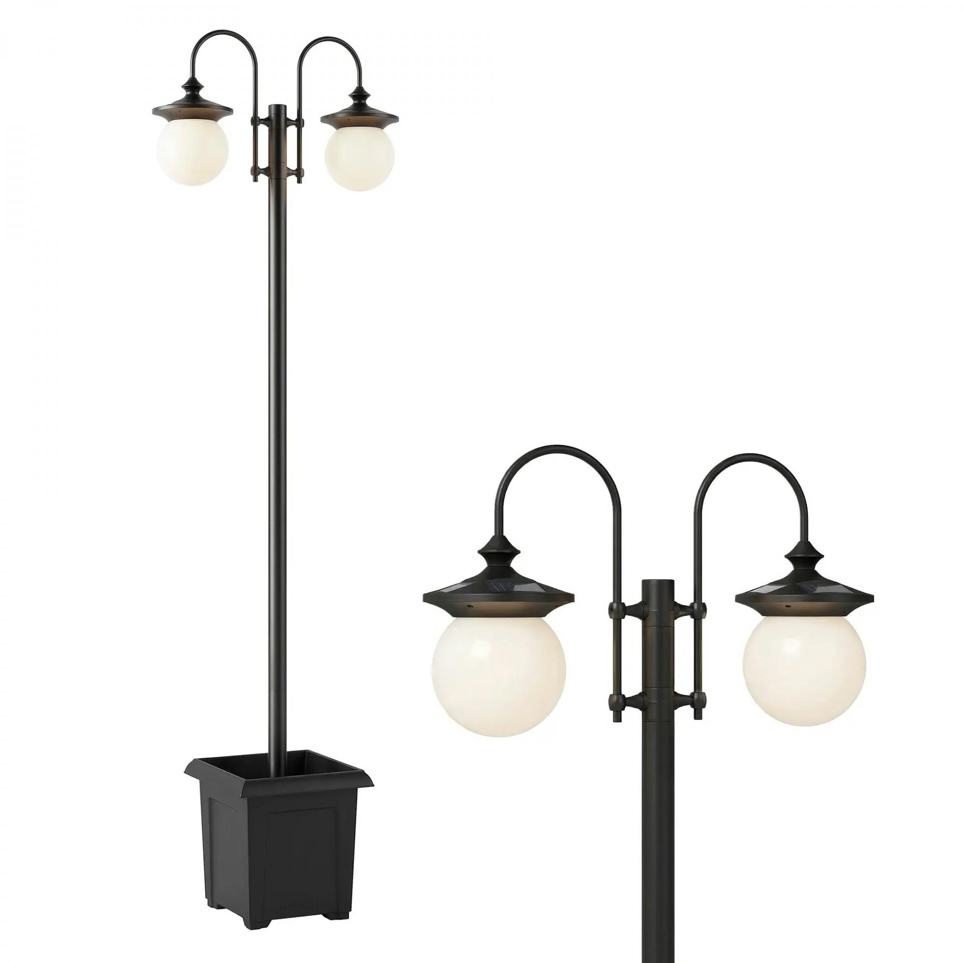 Farola Solar Exterior de Jardín con Macetero 2 Cabezales Impermeable IP44 Encendido/Apagado Automático Altura Ajustable