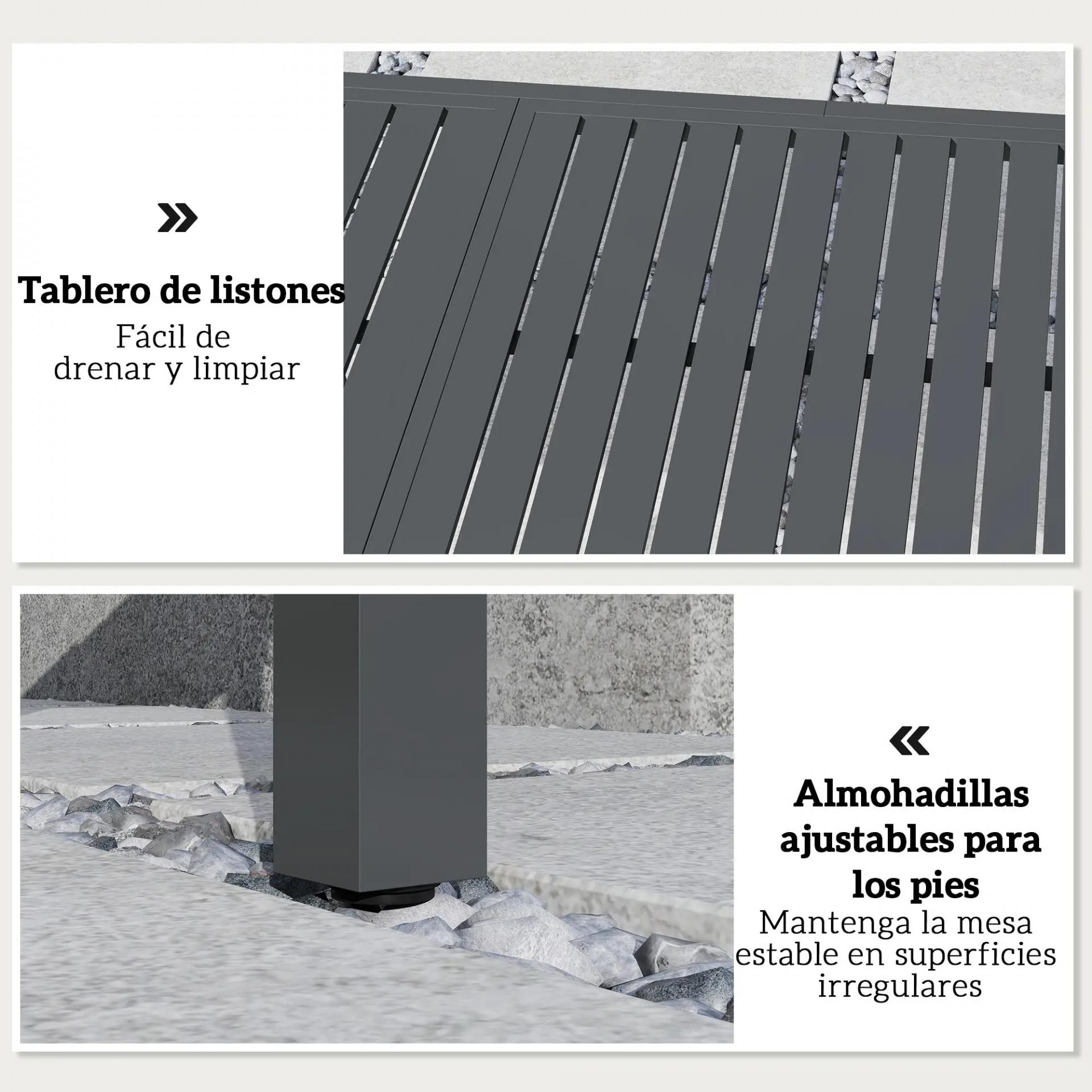 - - DETALLES PRÁCTICOS PARA EL DÍA A DÍA: El tablero ranurado de aluminio drena agua fácilmente. Las patas ajustables de esta mesa de jardín permiten microajustes de 0,1-0,8 cm, asegurando estabilidad en terrenos irregulares